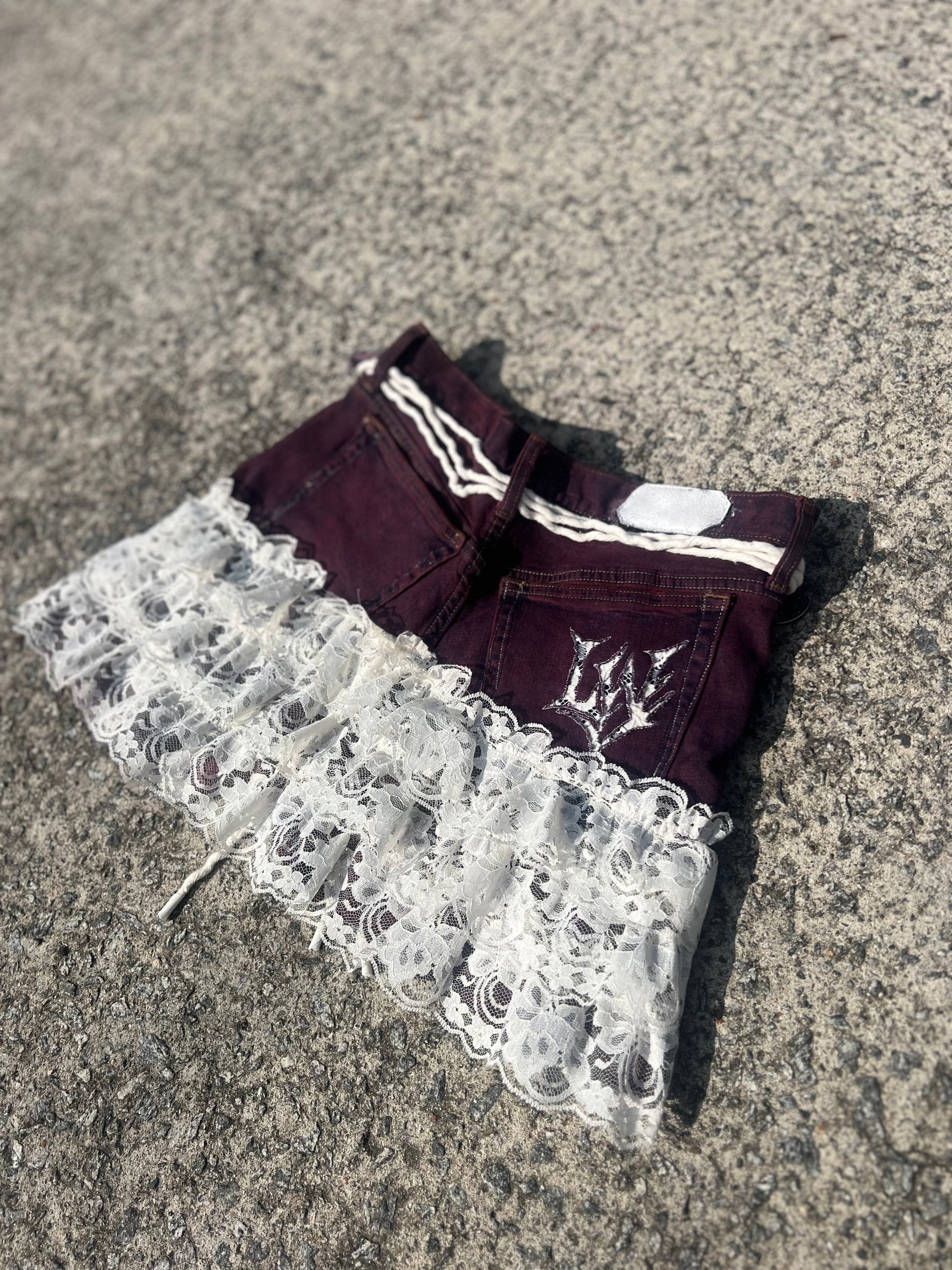 Fragment 02 Nebula Lace exists in a state of beautiful decay. Deep burgundy denim erupts into cascading white frayed threads, creating an ethereal lace-like effect that defies gravity. This piece captures the moment when solid matter transforms into cosmic mist—structured chaos frozen in fabric.